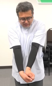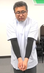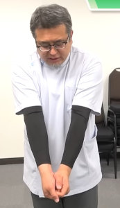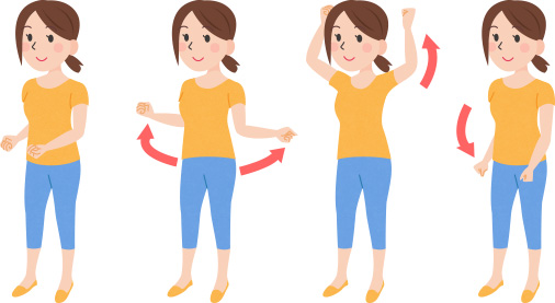 1.両ひじを90度程度に曲げ、肩を中心にして、前から後ろへ「上着を脱ぐ」感じで大きく5回まわします。
