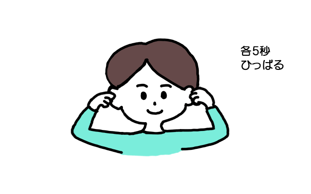 1.耳を軽くつまみ、上・下・横に5秒ずつ引っ張ります。